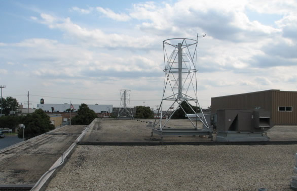 The 712V Aeroturbine consists of a helical rotor and airfoils housed within a 7 ft. x 12 ft. steel cage. The full system weighs approximately 907 lbs. including the alternator, without ballast. The standard 712V Aeroturbine is 24 ft. tall. The rated power @ 32 mph wind speed is 2500 Watts (149 RPM). The 712V is intended for vertical mounting and can be either bolted or ballasted down. Vertical Aeroturbines work well in winds from any direction, and therefore the presence of a dominant wind direction is not critical. The712V is modular and may be horizontally extended indefinately to create very large wind arrays covering entire urban, flat rooftops. | |||