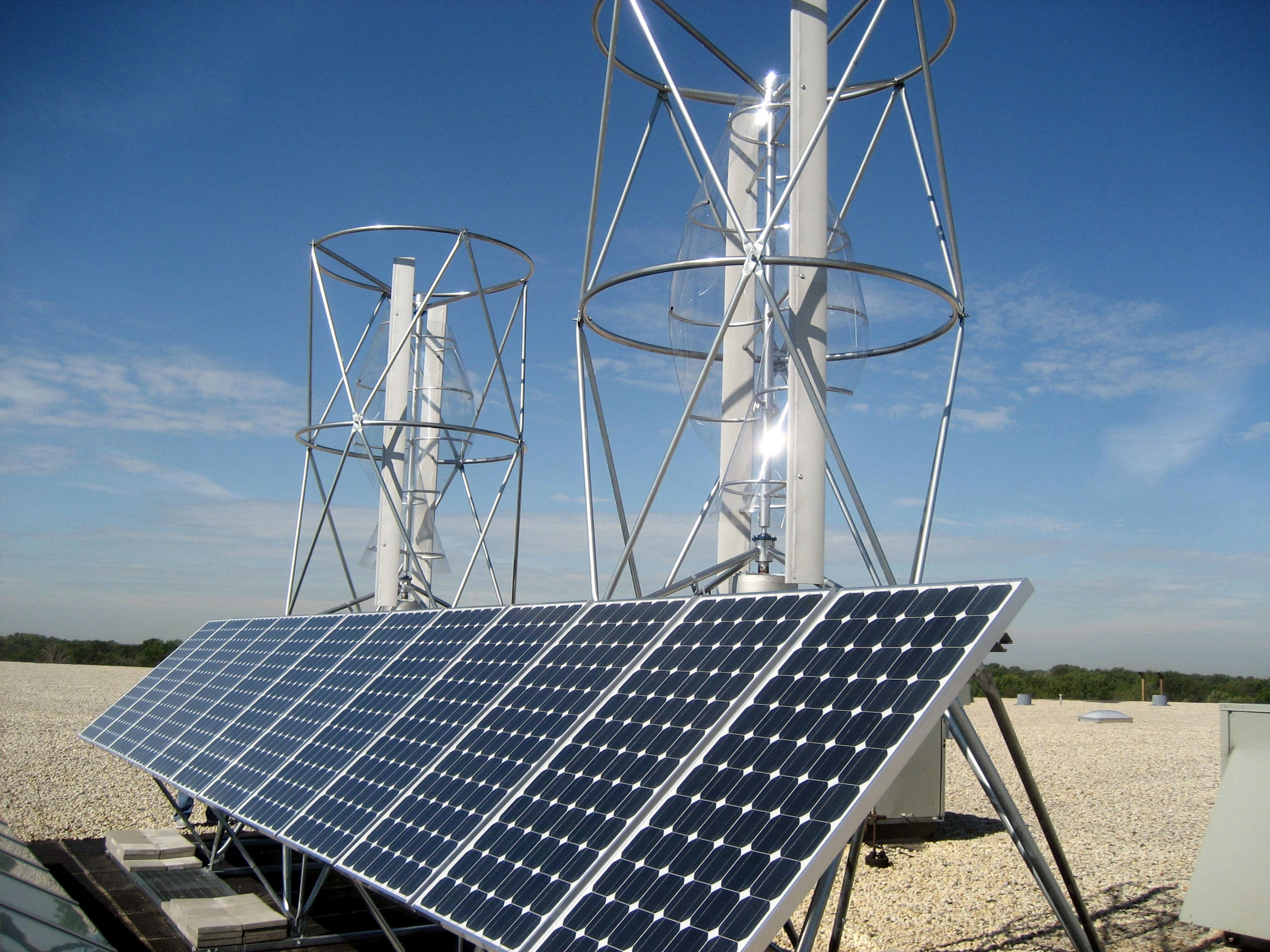 The first retail/commercial application for building-attached Aeroturbines with a connected ‘bridge’ of solar electric panels between twin vertical-axis wind machines is in Glenview, Illinois. In this unique installation, two Aeroturbines can be seen, spinning in the wind, through the atrium skylight above the retail showroom. The design concept for this project came from a strong collaboration between Aerotecture International Inc. and the Abt Electronics Team, lead by Michael Abt and Bob Taylor. The two 1000 Watt Aeroturbines are vertical-axis wind turbines as well as structural supports for a 2100 Watt ‘solar shelf’ of solar electric panels. This array takes advantage of both wind and solar resources and allows energy production during windy and/ or sunny weather. The rooftop AeroSolar Hybrid System can be seen in operation from the retail floor during regular store hours listed at the www.abtelectronics.com.