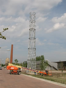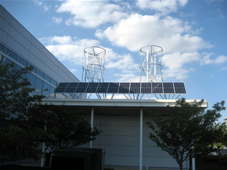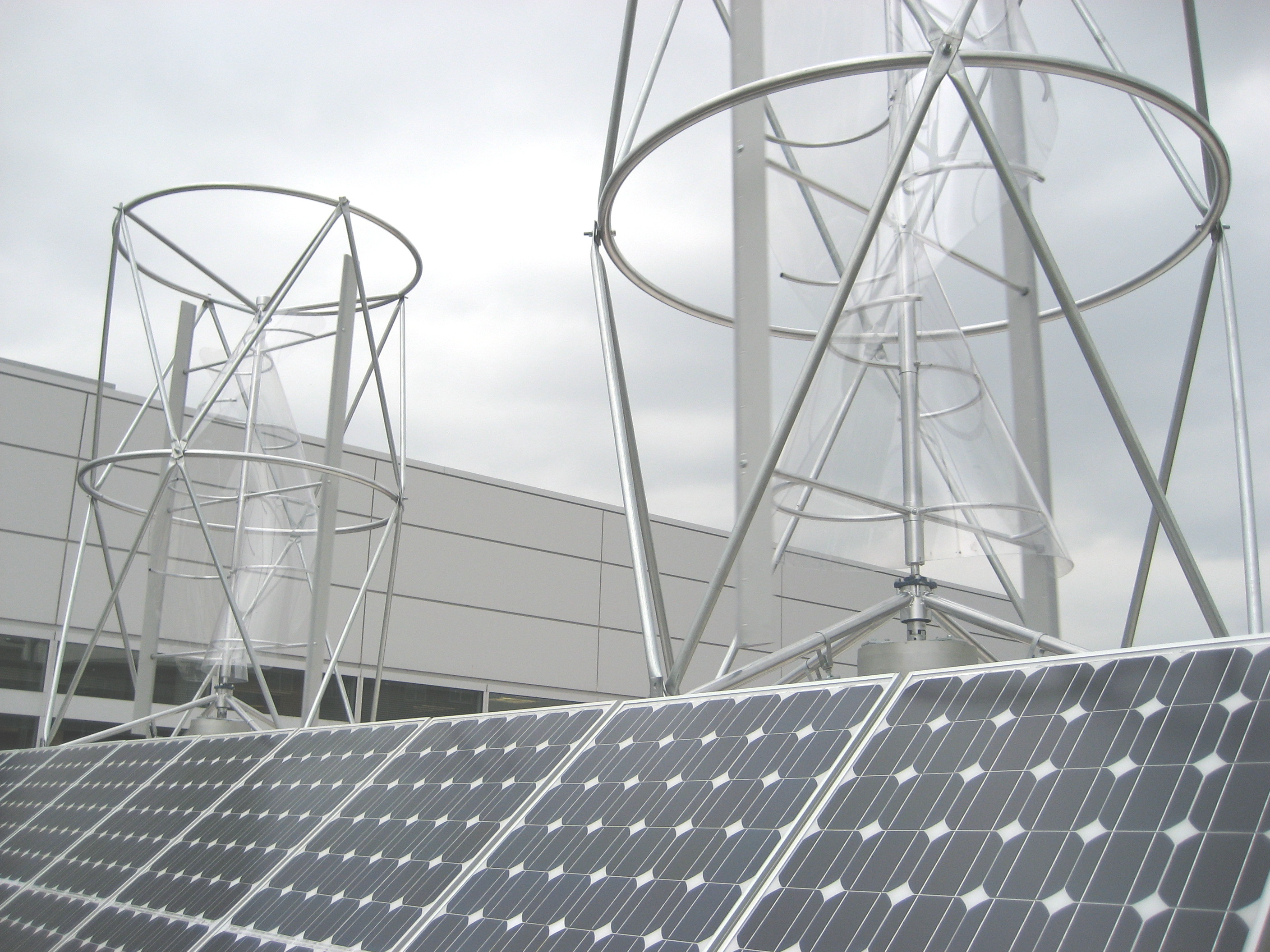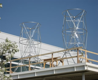 The first IBEW Local application for building-attached Aeroturbines with a connected ‘bridge’ of solar electric panels between twin vertical-axis wind machines installed in May, 2008..