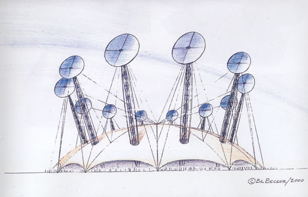 Proposed addition of building-integrated aeroturbines and tracking photovoltaic (sunflowers) - to be added to the existing structural supports of the Millenium Dome in London. It is estimated that these renewable energy systems would bring the energy budget of the building to zero over the course of an entire year. |