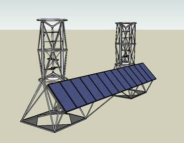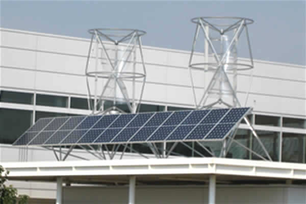 The 610V Hybrid Aeroturbine consists of twin helical rotors and airfoils housed within two 6 ft. x 10 ft. steel cages combined with a shelf of 12 photovoltaic solar panels. The full system weighs approximately 1400 lbs. including the alternators, without ballast. The standard 610V2 Hybrid Aeroturbine is 20 ft. tall and the solar shelf spans 31 ft. The typical power rating for each of the 12 solar panels is 175 Watts for a total of 2100 Watts. The 610V2 Hybrid is intended for vertical mounting and can be either bolted or ballasted down. Vertical Aeroturbines work well in winds from any direction, and therefore the presence of a dominant wind direction is not critical. The 610V2 Hybrid is modular and may be horizontally extended indefinately to create very large wind and solar electric arrays covering entire urban rooftops. | |||