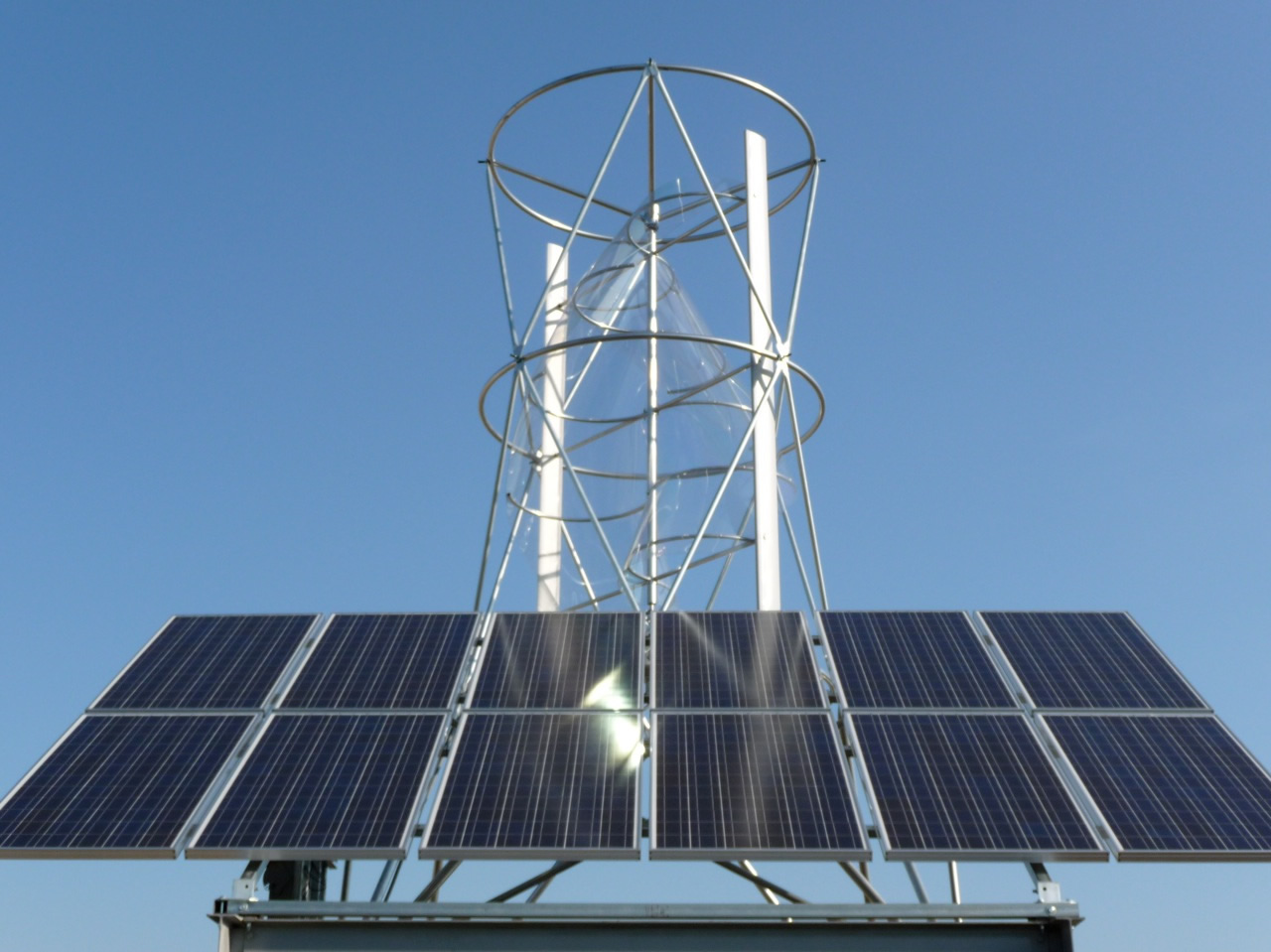 The 712V Hybrid Aeroturbine consists of a helical rotor and airfoils housed within 7 ft. x 12 ft. steel cage combined with a shelf of 12 photovoltaic solar panels. The full system weighs approximately 1400 lbs. including the alternator, without ballast. The standard 712V Hybrid Aeroturbine is 24 ft. tall and the solar shelf spans 17 ft. The typical power rating for each of the 12 solar panels is 175 Watts for a total of 2100 Watts. The 712V Hybrid is intended for vertical mounting and can be either bolted or ballasted down. Vertical Aeroturbines work well in winds from any direction, and therefore the presence of a dominant wind direction is not critical. The 712V Hybrid is modular and may be extended indefinately to create very large wind and solar electric arrays covering entire urban, flat rooftops. | |||