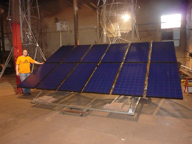 SunStrut is the name of Aerotecture International’s 12 panel PV support structure. Each SunStrut holds 12 – 175 Watt solar electric individual panels and is ballasted (held down by weight) to flat roofs. Each SunStrut can produce up to 2100 Watts of electricity and 2500 kWhs per year. Prices are determined on number purchased and project location. The SunStruts have 8’ X 10’ steel support stands and twin ‘ladders’ each with 5-6 PV panels reaching to 17 feet horizontally and approximately 3 feet above roof level. The typically 2100 Watt, ballasted, SunStrut structures: Can hold up to 12 - 175 watt solar panels Extensive field testing in winds up to 70 mph has shown excellent performance from the SunStrut support structure combination. SunStruts have proven to be safe, completely quiet, vibration-free and maintenance minimal. They are designed to be adjustable to sit above midwest snow levels and do not have expansion problems. Each SunStrut system includes a variable height structural option, modular and changeable ladders capable of holding a wide range of standard frame photovoltaic panels and a frame-mounted DC shutoff that meets or exceeds NEC solar disconnect provisions. When installed with Aeroturbines they force the wind directly into the turbines rotor - making them a perfect pair. It is estimated the SunStrut systems can produce more than 2,500 kWhs of solar power per year in the Great Lake states of the USA. |