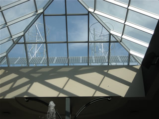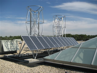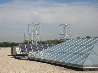 The first retail/commercial application for building-attached Aeroturbines with a connected ‘bridge’ of solar electric panels between twin vertical-axis wind machines is in Glenview, Illinois. In this unique installation, two Aeroturbines can be seen, spinning in the wind, through the atrium skylight above the retail showroom. The design concept for this project came from a strong collaboration between Aerotecture International Inc. and the Abt Electronics Team, lead by Michael Abt and Bob Taylor. The two 1000 Watt Aeroturbines are vertical-axis wind turbines as well as structural supports for a 2100 Watt ‘solar shelf’ of solar electric panels. This array takes advantage of both wind and solar resources and allows energy production during windy and/ or sunny weather. The rooftop AeroSolar Hybrid System can be seen in operation from the retail floor during regular store hours listed at the www.abtelectronics.com.
