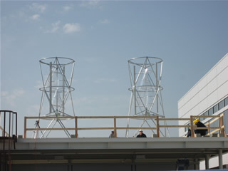 The first IBEW Local application for building-attached Aeroturbines with a connected ‘bridge’ of solar electric panels between twin vertical-axis wind machines installed in May, 2008..